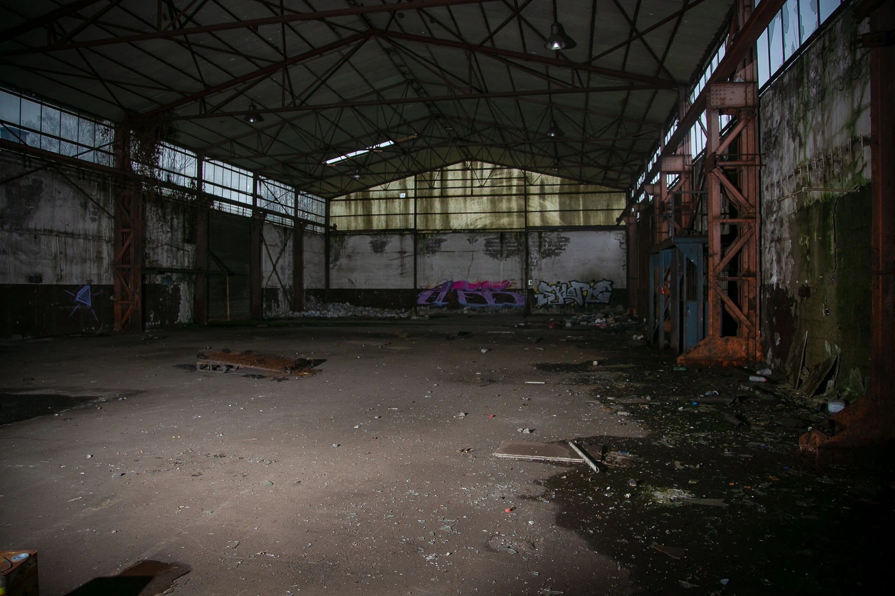 Die Fabrikhalle war verlassen aber einfach zugänglich. Es war relativ dunkel, so das ich häufig einen Blitz einsetzen musste. Es war bereits ein Verfall und eine Nutzung von Graffiti Künstlern zu beobachten. Im Obergeschoss waren teilweise noch Möbel, Akten und Werkzeuge, die von einem abrupten Ende der Nutzung zeugen. Einige Bereiche schienen baufällig, so das wir diese gemieden haben.