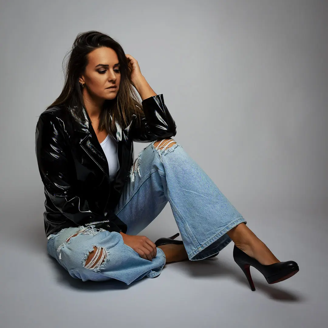 Fotoshooting mit Jana in verschiedenen Outfits, unter anderem einem Lederkleid.
