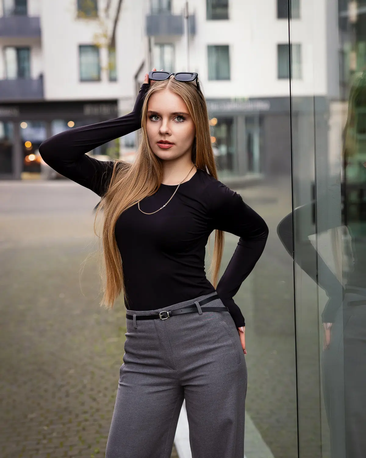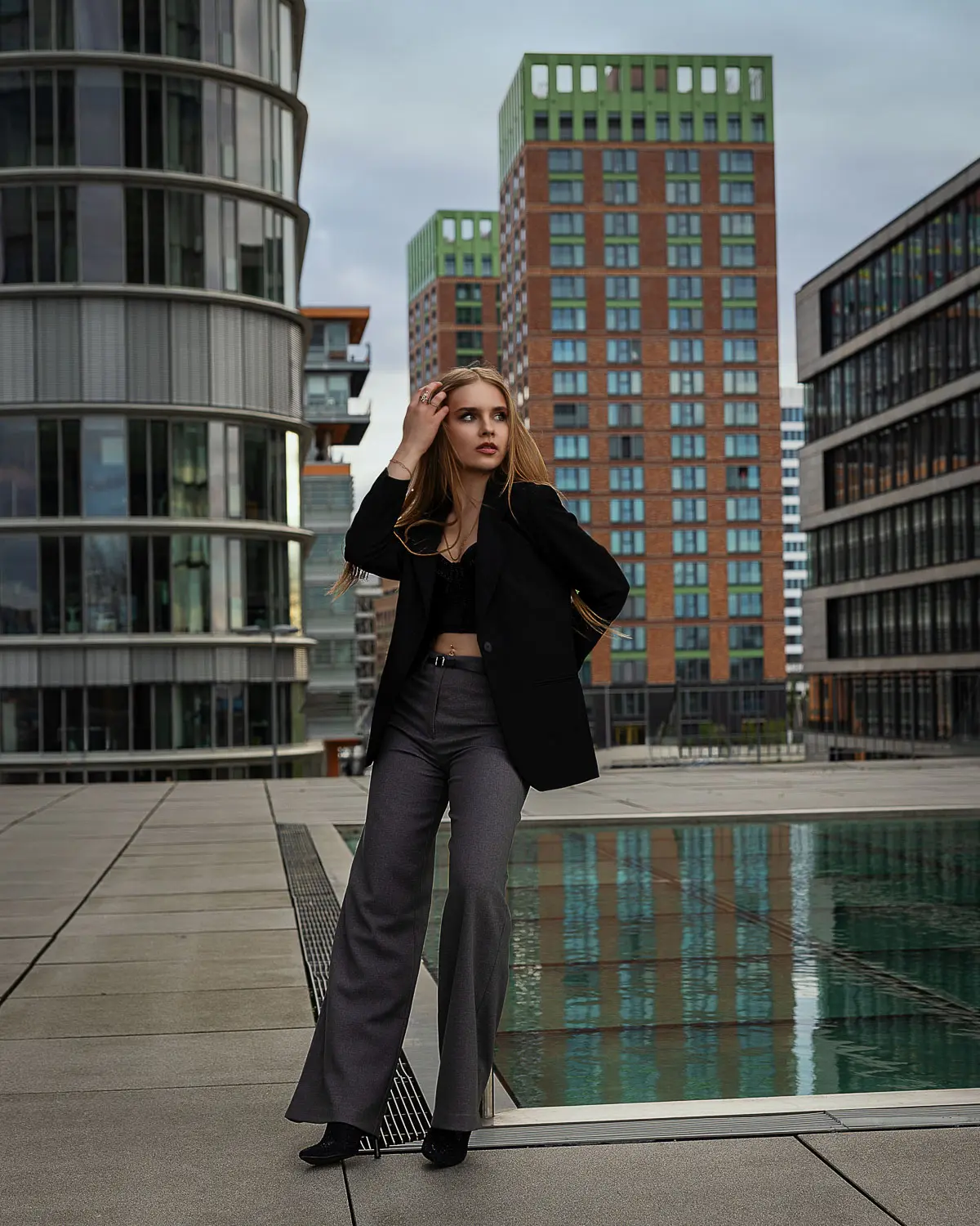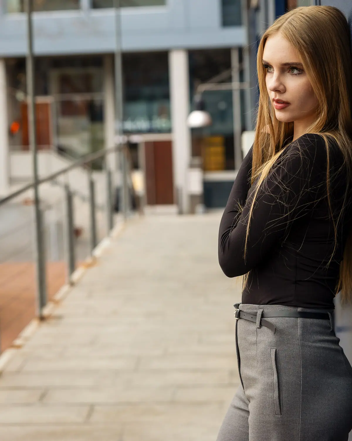 Anastasiia trug zu Beginn eine enge graue Hose und ein schwarzes Oberteil mit Blazer. Wir haben zunächst Fotos mit dem Blazer gemacht und dann ohne. Anschließend hat sie das schwarze Oberteil durch eine Corsage ersetzt und den Blazer wieder darübergezogen – durch dieses Layering entstanden mehrere verschiedene Looks, ohne dass ein kompletter Outfitwechsel nötig war. Später zog Anastasiia noch ein langes, enges Kleid an. Dazu hatte sie mehrere Paar hohe Schuhe dabei.