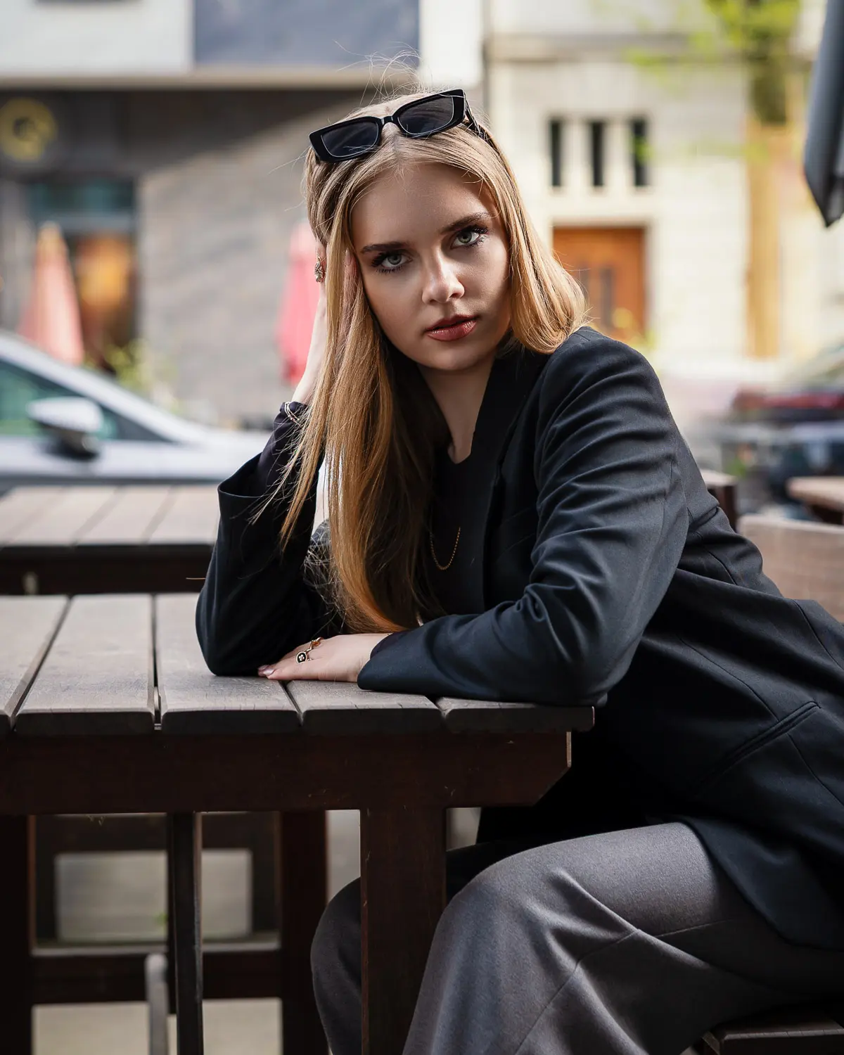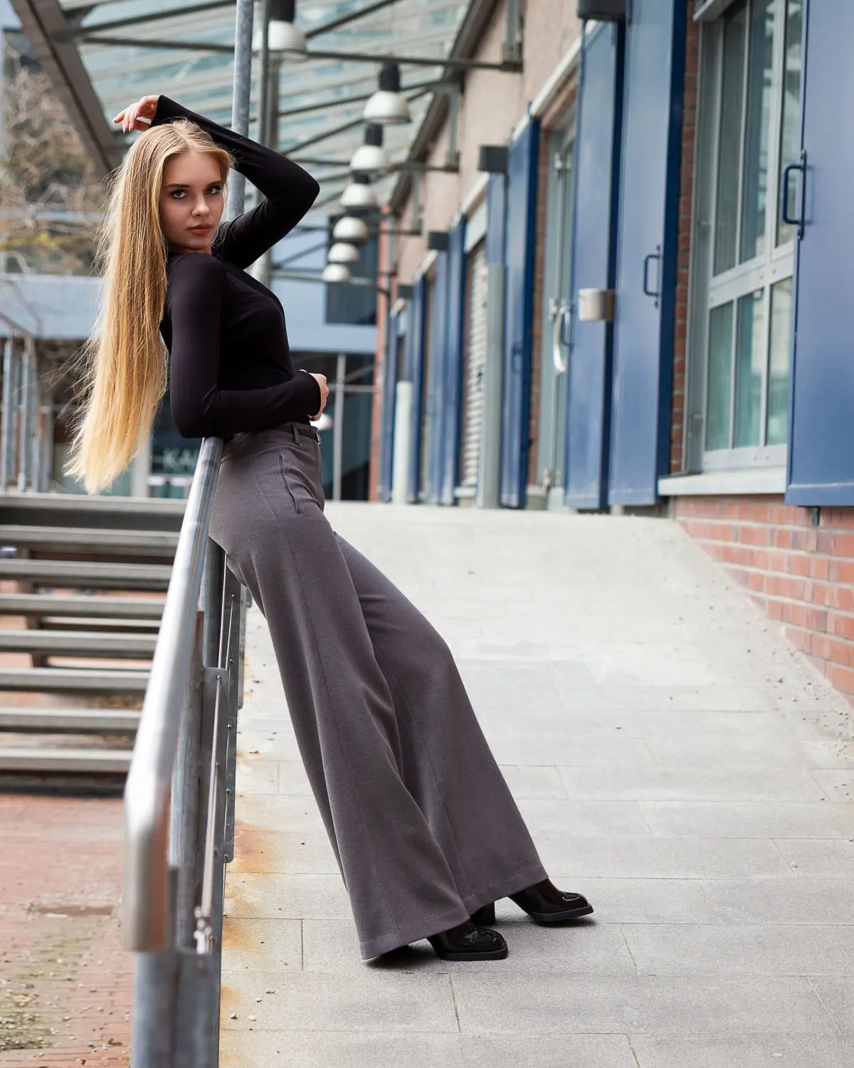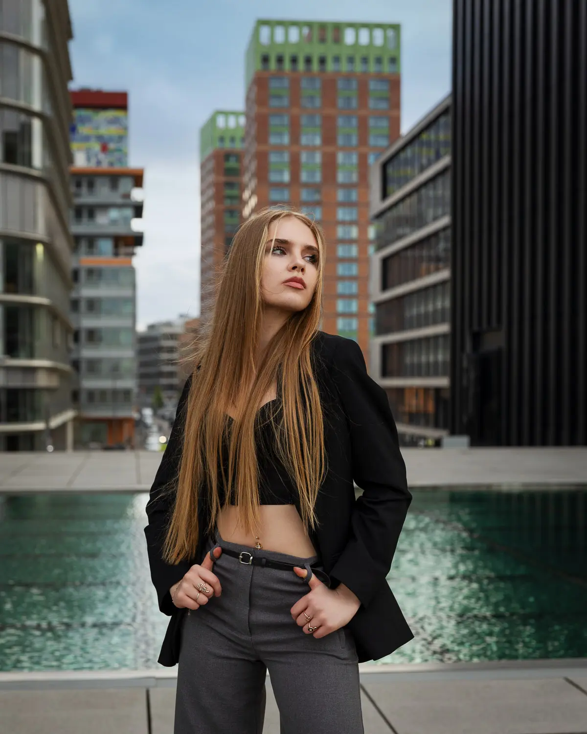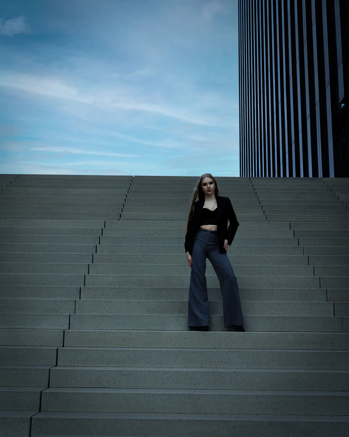 Anastasiia trug zu Beginn eine enge graue Hose und ein schwarzes Oberteil mit Blazer. Wir haben zunächst Fotos mit dem Blazer gemacht und dann ohne. Anschließend hat sie das schwarze Oberteil durch eine Corsage ersetzt und den Blazer wieder darübergezogen – durch dieses Layering entstanden mehrere verschiedene Looks, ohne dass ein kompletter Outfitwechsel nötig war. Später zog Anastasiia noch ein langes, enges Kleid an. Dazu hatte sie mehrere Paar hohe Schuhe dabei.