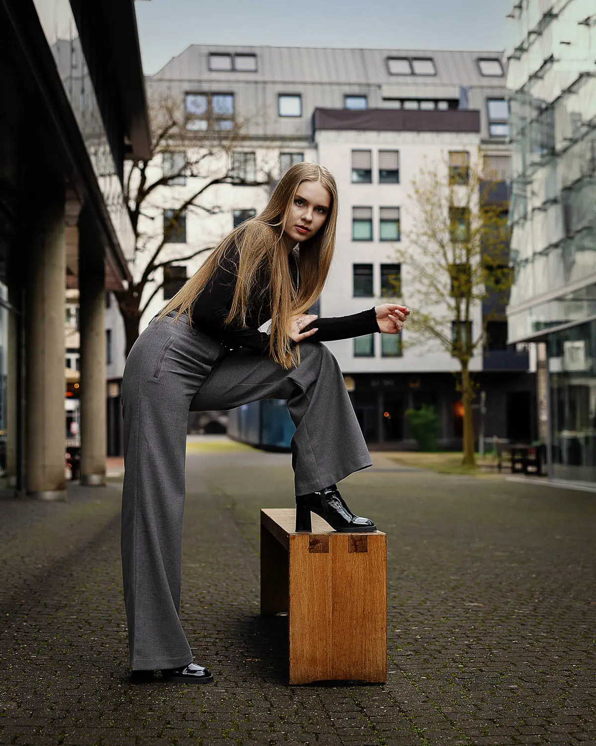 Es sind fast 300 Bilder entstanden. Da wir in kurzer Zeit viele verschiedene Locations aufgesucht haben und Anastasiia die Kleidung gewechselt hat, sind mehr als ein Dutzend verschiedene Settings entstanden, aus denen Anastasiia sich jeweils ein Bild ausgewählt hat. Diese habe ich dann einzeln in Photoshop bearbeitet – im Schnitt etwa 10 Schritte pro Bild: Umbenennen, Hintergrund aufräumen, Farbkorrektur in Camera Raw, Flecken entfernen, Dodge & Burn, Gradationskurve anpassen, Konturen korrigieren, Color Lookup, Schärfen sowie finaler Bildausschnitt und Vignette in Lightroom.